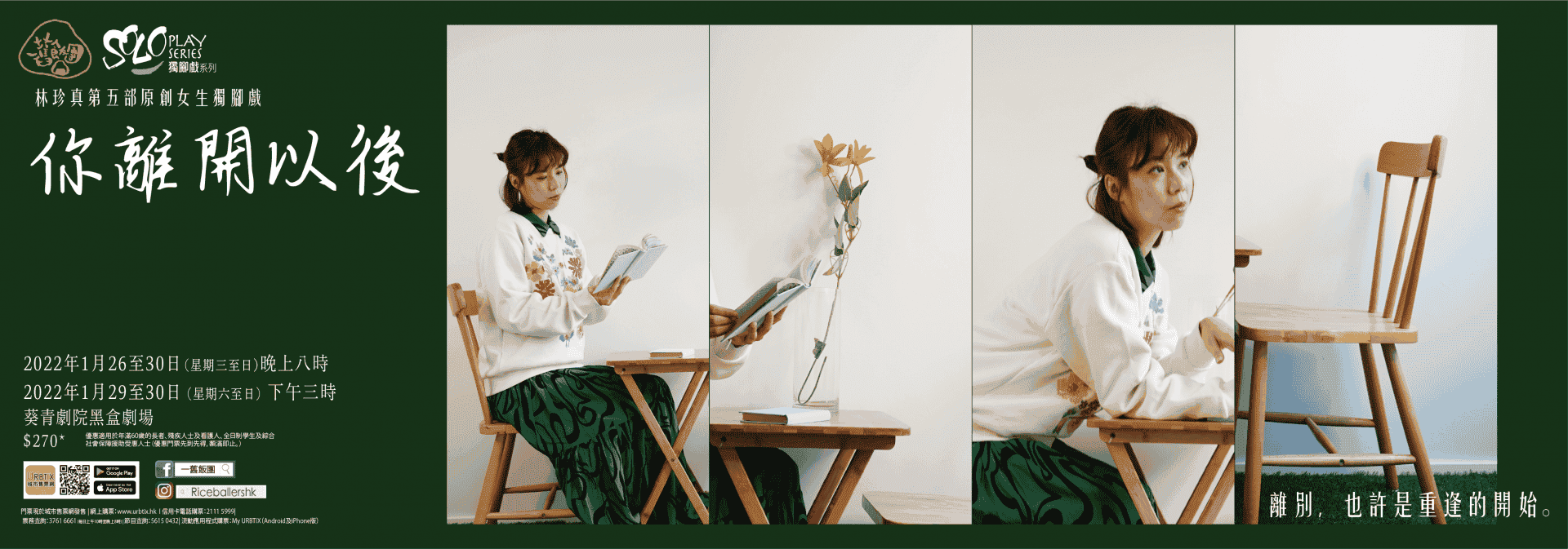 【节目取消】 因应2019冠状病毒病的最新情况,康乐及文化事务署暂停开放辖下表演场地,一旧饭团原定于2022年1月26至30日(星期三至日)在葵青剧院黑盒剧场举行的「独脚戏」系列:一旧饭团《你离开以后》将会取消。 观众请保留完整门票(连同票根)办理退票。有关退票安排,请留意一旧饭团网站的最新消息︰一旧饭团