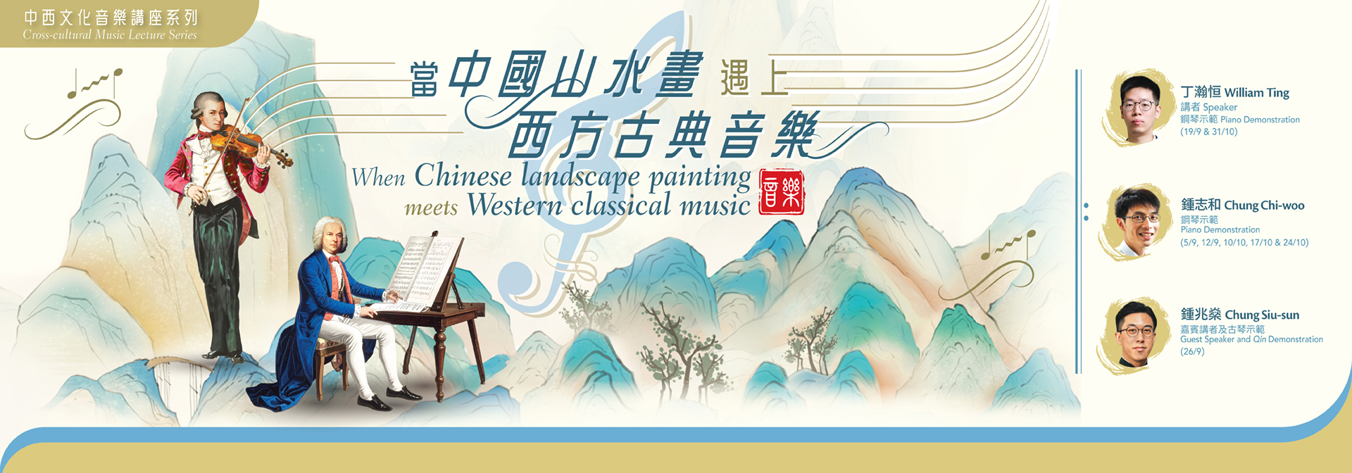 中國山水畫與西方古典音樂是截然不同的藝術類型。它們看似毫不相關,並且各有自身的歷史發展。可是,若從特定的視角觀察,這兩種藝術的本質不僅相通,而且能夠緊密接合。是次講座系列,試圖突破中西文化之隔閡,為大家帶來一個觀畫與賞樂的嶄新體驗。此外,講者將以多幅香港藝術館的藏品與展品作為探討對象,好讓各位在聽講之餘,也有機會親自認識一眾珍貴的傳世墨跡。