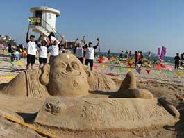 日本鹿儿岛日置市的堆沙代表队应邀来港示范堆沙技巧。他们的作品取名「许愿吧!」,以《天方夜谭》中「阿拉丁神灯」的精灵为创作蓝本,造型栩栩如生,令人叹为观止。 |