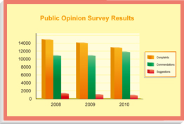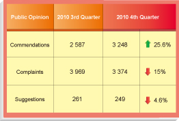 Our 'Views from the Public' system maintains a database of feedback received through various channels about the Department's policies, facilities and services. The information is regularly analysed according to type, nature and cause, and reported to management to help them enhance areas that need improvement. The system is being enhanced in 2010/11 to include cross-departmental complaints, anonymous complaints and proforma complaints.
