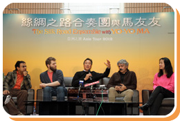 Famous cellist Yo-Yo Ma and members of the Silk Road Ensemble introduce their new concert to the media. |