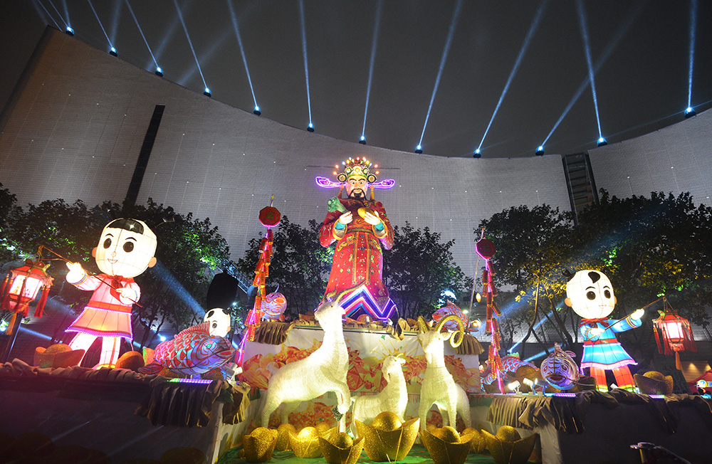 A lantern display depicting the God of Fortune with three rams. |