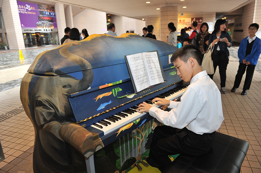 One of the artistically decorated pianos set up in the piazza of the Hong Kong Cultural Centre for passers-by to play on. |