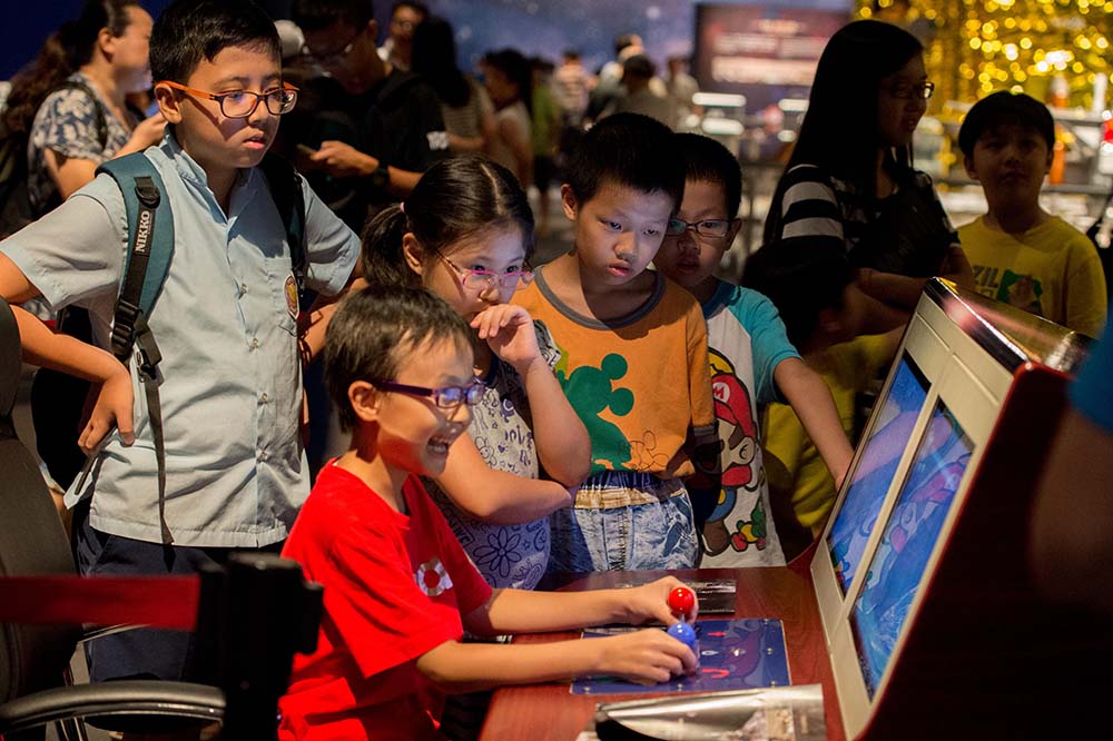 A young visitor controls the movements of a model of the Yutu Lunar Rover. |