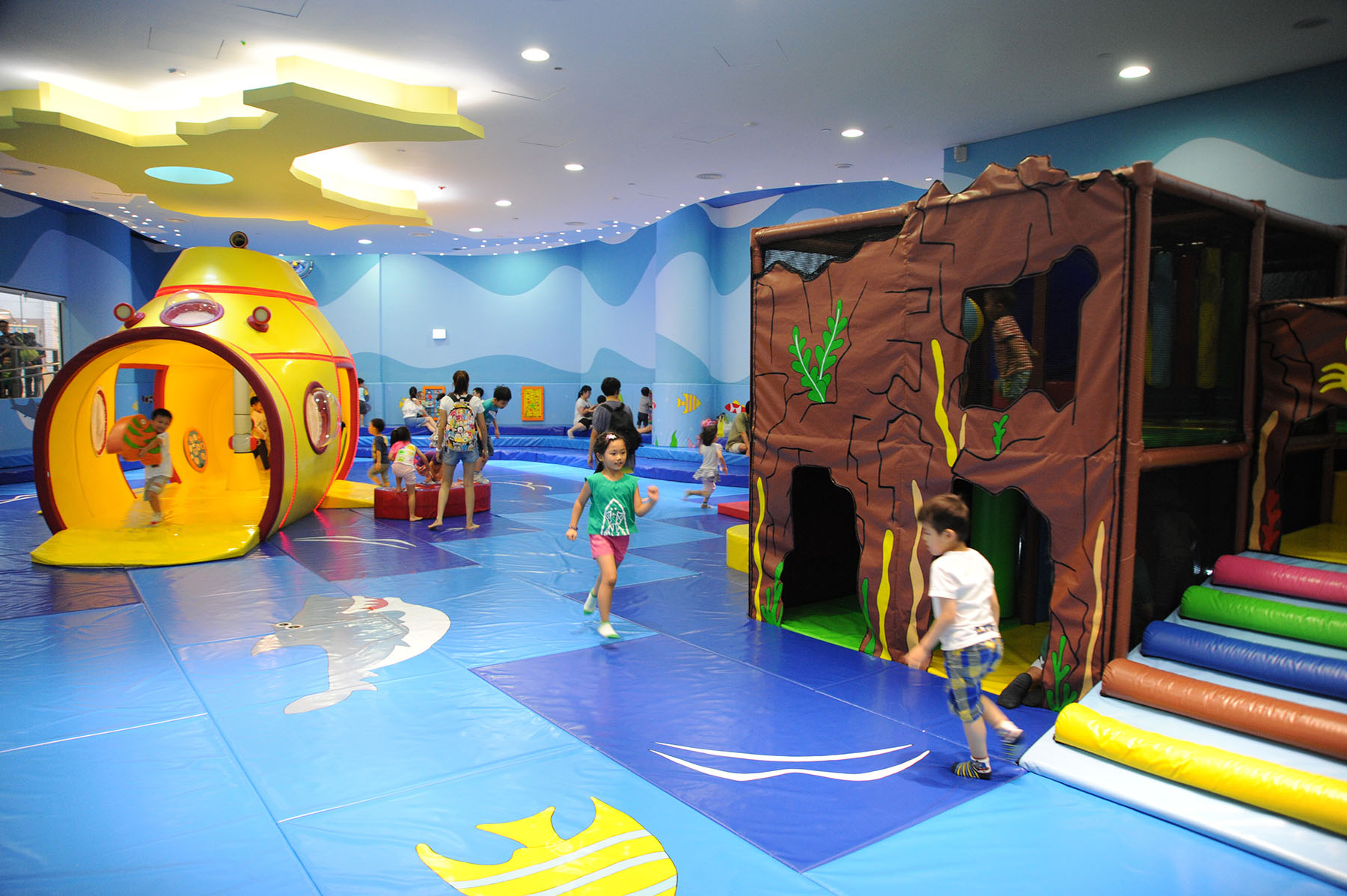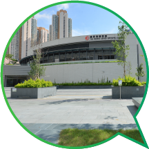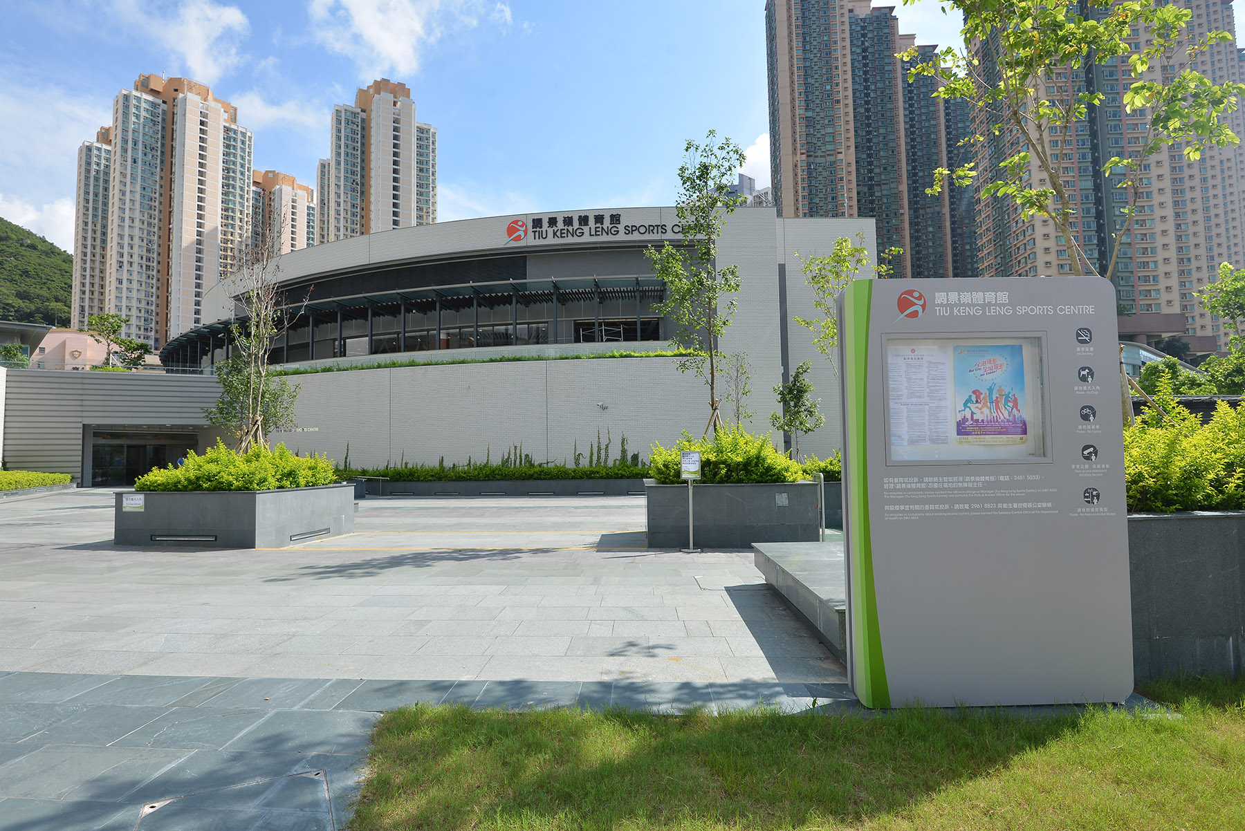 The Tiu Keng Leng Sports Centre was opened in phases since April 2015 and quickly established itself as one of the most popular sports centres in Sai Kung District. The sports centre includes a multi-purpose arena with a seating capacity of 1 200 that is suitable for large-scale events, and which can be configured as two basketball courts, two volleyball courts, or eight badminton courts. It also houses six multi-purpose activity rooms, a children's play room, a fitness room with 39 sets of fitness equipment, a 150-meter indoor jogging track, an outdoor climbing wall and other ancillary facilities. The one-hectare open space outside the sports centre provides facilities such as a landscaped sitting-out area, a children's playground, a fitness corner for the elderly, and a variety of fitness stations.