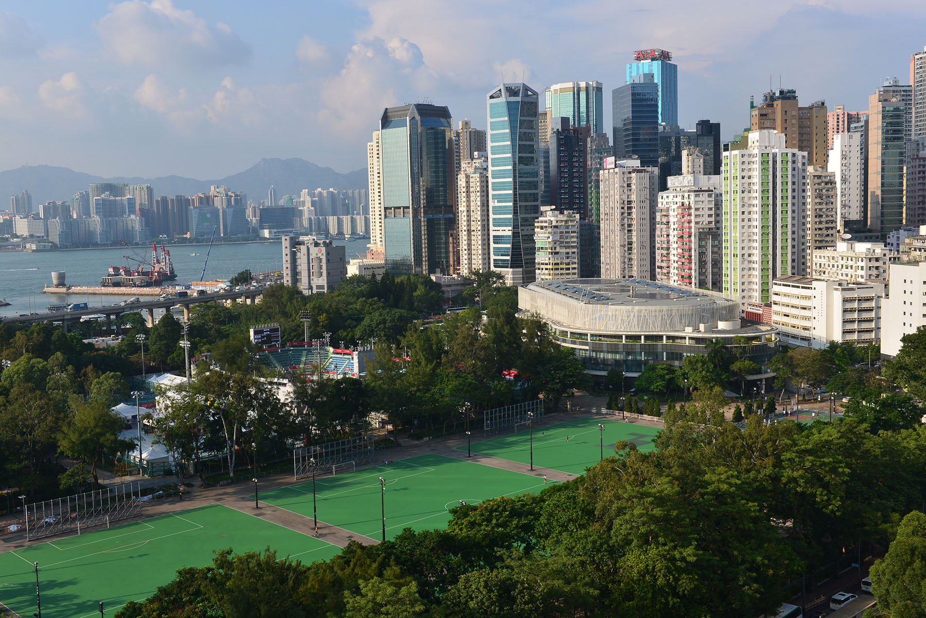 Covering an area of over 19 hectares, Victoria Park is the largest park on Hong Kong Island and one of the most well-used parks in Hong Kong. In addition to many passive facilities such as its central lawn, bandstand and pebble walking trail, the park offers several popular sports facilities including soccer pitches, basketball courts, handball cum volleyball courts, roller skating rinks, a bowling green, fitness stations, and jogging trails.