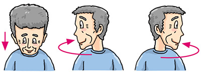 Lower your head and turn to the right slowly. Return to the starting position. Then turn your head to the left slowly. Repeat 4 times.