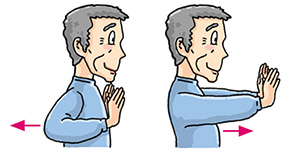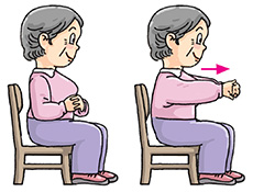 Sit down. Interlock your fingers and put them in front of your chest with palms facing out or in. Push your arms forward slowly. Hold for 10 to 30 seconds. Return to the starting position. Repeat 2 to 4 times.
