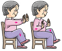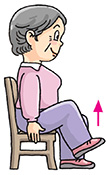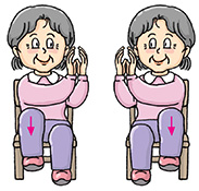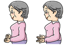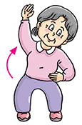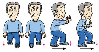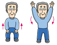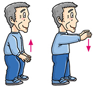 | Stand erect with your feet shoulder-width apart. Bend your knees slightly with arms hanging down in front of you. Raise your arms slowly in front of your chest with palms facing downward and inhale. Straighten your knees when your arms reach the shoulder level. Then, put down your arms slowly and exhale. Return to the knees-bent position. Perform 4 to 6 times. |