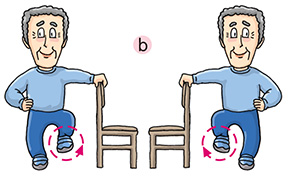 Put one hand on the back of a chair or a table and stand erect. Stand steadily on one leg and raise the other slightly. Turn the sole of your foot inward 8 times and outward another 8 times. Return to the starting position. Repeat with the other leg.