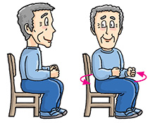 Sit down with your back slightly away from the back of the chair. Keep your back straight. Lift your forearms to waist level. Turn your upper body slowly to the right and backward as far as possible. Hold for 10 to 30 seconds. Return to the starting position and repeat with the other side. Repeat 2 to 4 times for each side.