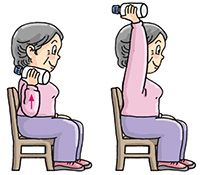 Sit on a chair. Hold a plastic bottle containing about 500 ml of water with your right hand. Raise your right arm and keep it straight. Return slowly to the starting position. Perform 10 times with each arm.