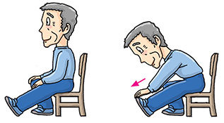 Sit on the front half of a chair with your back away from the chair back. Keep your back straight. Bend your right leg with the sole touching the floor. Straighten your left leg with the heel touching the floor and toes pointing upward. Slowly bend your waist and stretch your hand toward the direction of your left toes. Hold for 10 to 30 seconds. Return to the starting position and repeat with the other side. Repeat 2 to 4 times for each side.