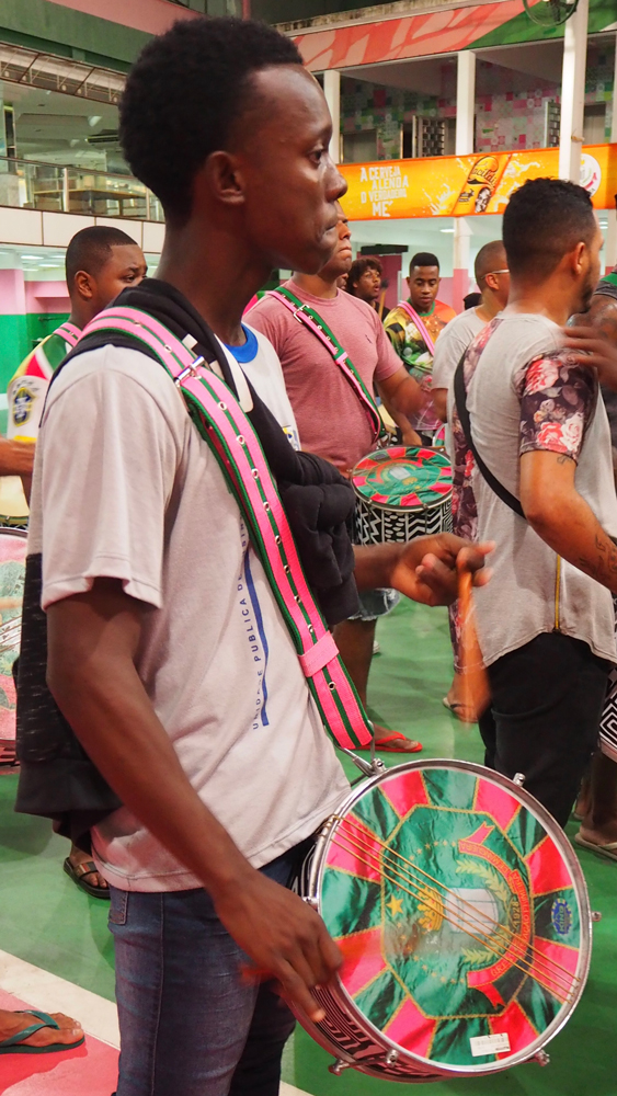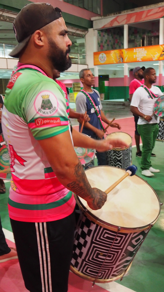 Mangueira is a traditional samba school established in Rio de Janeiro nearly a century ago, with green and pink as its official colours. A percussion rehearsal by the school is seen in this excerpt.