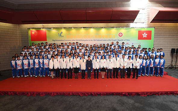 To publicise the HKSAR Delegation’s participation in the 13th National Games of the People’s Republic of China (the 13th National Games) and give a boost to the morale of the delegation, the Organising Committee of the HKSAR Delegation (the Organising Committee) staged the Flag Presentation Ceremony of the HKSAR Delegation to the 13th National Games at the Hong Kong Cultural Centre, Tsim Sha Tsui at 5:00pm on 10 August 2017. The Ceremony was officiated by the Chief Executive, Mrs Carrie LAM and attended by the following guests including the Secretary for Home Affairs and Head of the HKSAR Delegation, Mr LAU Kong-wah; President of the Sports Federation & Olympic Committee of Hong Kong, China and Chairman of the Organising Committee, Mr Timothy FOK; the Permanent Secretary for Home Affairs and Honorary Adviser of the HKSAR Delegation, Mrs Betty FUNG; the Director of Leisure and Cultural Services and Vice-Chairman of the Organising Committee, Ms Michelle LI; and the Vice-Chairman of the Organising Committee and Chairman of its Executive Committee, Mr Tony YUE.