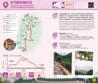 | 路线详情 | 由华发游乐场出发,沿石级上行接屯门健身径(麦理浩径第十段)后再转屯门径,经虎地往蓝地水塘,沿途泥路及混凝土路各半,属易行的山径,景观开扬。中段屯门径山路有点崎岖,需留意同行小童。完成旅程后,可以到妙法寺前方的「蓝地大街」饱餐一顿。 |