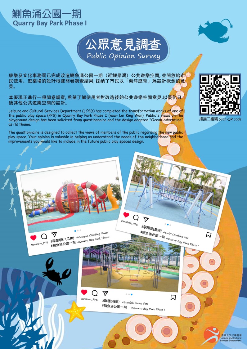 为瞭解公众对改造后的公共游乐空间的看法,现诚邀您填写近期完成改造的公共游乐空间的网上问卷:深水埗公园: 《网上问卷》塘尾道儿童游乐场: 《网上问卷》鲗鱼涌公园: 《网上问卷》桂芳街游乐场: 《网上问卷》