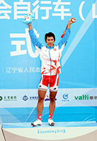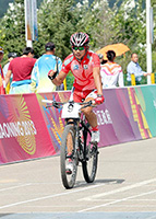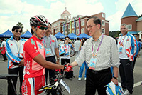 The Secretary for Home Affairs, Mr Tsang Tak-shing, today (September 1) watched the cycling mountain bike cross-country event of the 12th National Games. Picture shows Mr Tsang shaking hands with Mr Chan and extending his congratulations after he won the bronze medal. |